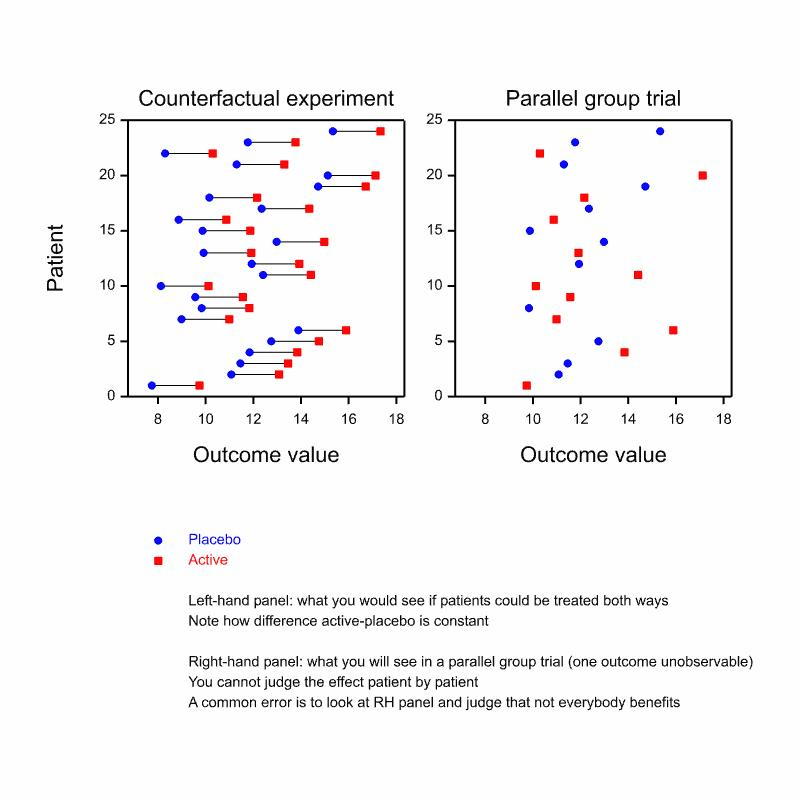 There is a very obvious trap (or at least it ought to be obvious to all statisticians) in naively using reported response rates as an indicator of variation in true response[5]. This can be illustrated using the graph below. On the left hand side you see an ideal counterfactual experiment. Every patient can be treated under identical conditions with both treatments. In this thought experiment the difference that the treatment makes to each patient is constant. However, life does not afford us this possibility. If what we choose to do is run a parallel group trial we will have to randomly give the patient either placebo or the active treatment. The right hand panel shows us what we will see and is obtained by randomly erasing one of the two points for each patient on the left hand panel. It is now impossible to judge individual response: all that we can judge is the average.