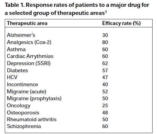 The question that immediately arose in my mind was ‘how do the FDA know this is true?’ Well, the Agency very helpfully tells you how they know this is true. They cite a publication, ‘Clinical application of pharmacogenetics’[1] as the source of the chart. Slightly surprisingly, the date of the publication predates the FDA report by 12 years (this is pre-history in pharmacogenetic terms) however, sure enough, if you look up the cited paper you will find that the authors (Spear et al) state ‘We have analyzed the efficacy of major drugs in several important diseases based on published data, and the summary of the information is given in Table 1.’ This is Table 1: