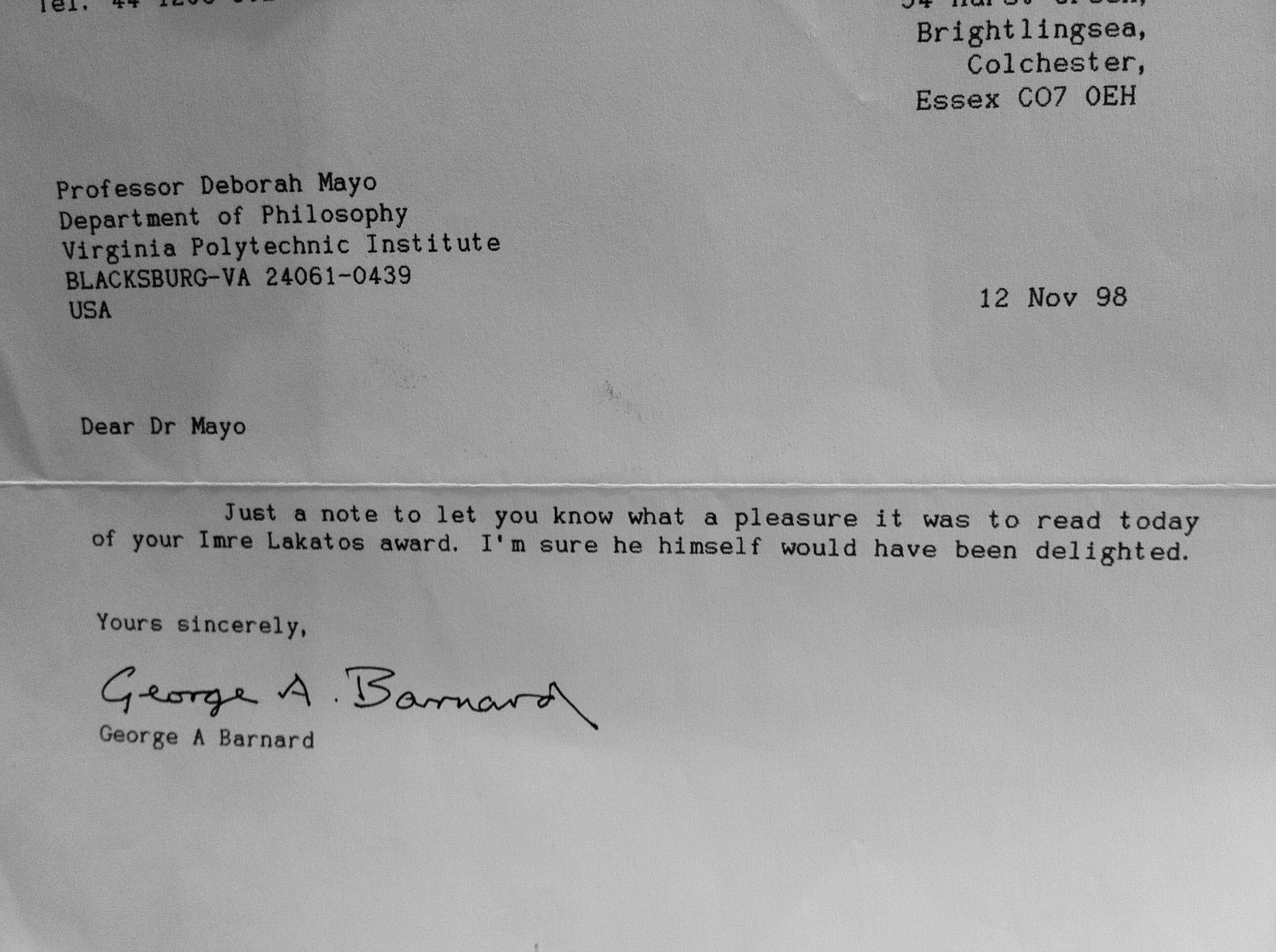 Barnard: I read your paper. I think it is quite good. Did you know that it was I who told Fisher that Neyman-Pearson statistics had turned his significance tests into little more than acceptance procedures?