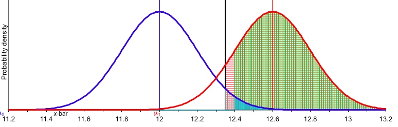 Note: the Type 2 error probability in relation to alternative µ = 12.6 is.16. This is the area to the left of 12.4 under the red curve above. Pr(M < 12.4; μ = 12.6) = Pr(Z < -1) = .16 = β(12.6).
