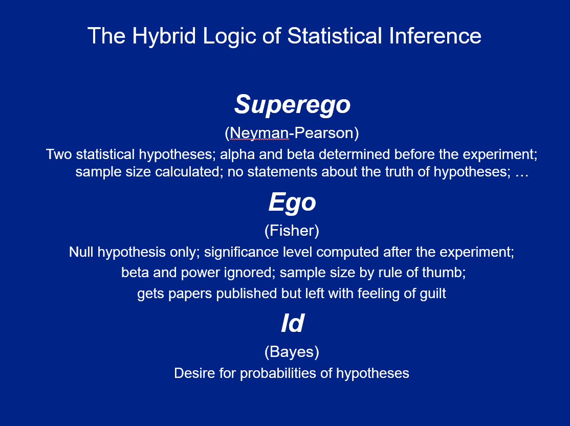 I’m curious as to how he/we might cash out teaching “a toolbox of statistical methods by Fisher, Neyman-Pearson, Bayes….” Each has been open to caricature, to rival interpretations and philosophies, and each includes several methods. There should be a way to recognize distinct questions and roles, without reinforcing the “received view” that lies behind the guilt and anxiety confronting the researcher in Gigerenzer’s famous “superego-ego-id” metaphor (SLIDE #3):