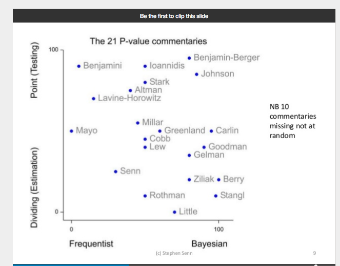 I’m surprised it’s a year already since posting my published comments on the ASA Document on P-Values. Since then, there have been a slew of papers rehearsing the well-worn fallacies of tests (a tad bit more than the usual rate). Doubtless, the P-value Pow Wow raised people’s consciousnesses. I’m interested in hearing reader reactions/experiences in connection with the P-Value project (positive and negative) over the past year. (Use the comments, share links to papers; and/or send me something slightly longer for a possible guest post.)