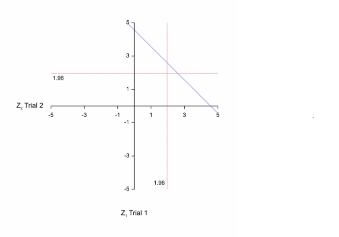 “If the designs of two trials are identical, then given that they are of the same size, the sufficient statistic is simply the average of the two results. If conducted simultaneously there would be no reason not to use this. This leads to a critical region for a more powerful test based on the average result from the two providing a 1/1600 type I error rate (one-sided) illustrated in the figure below that is to the right and above the blue diagonal line.”