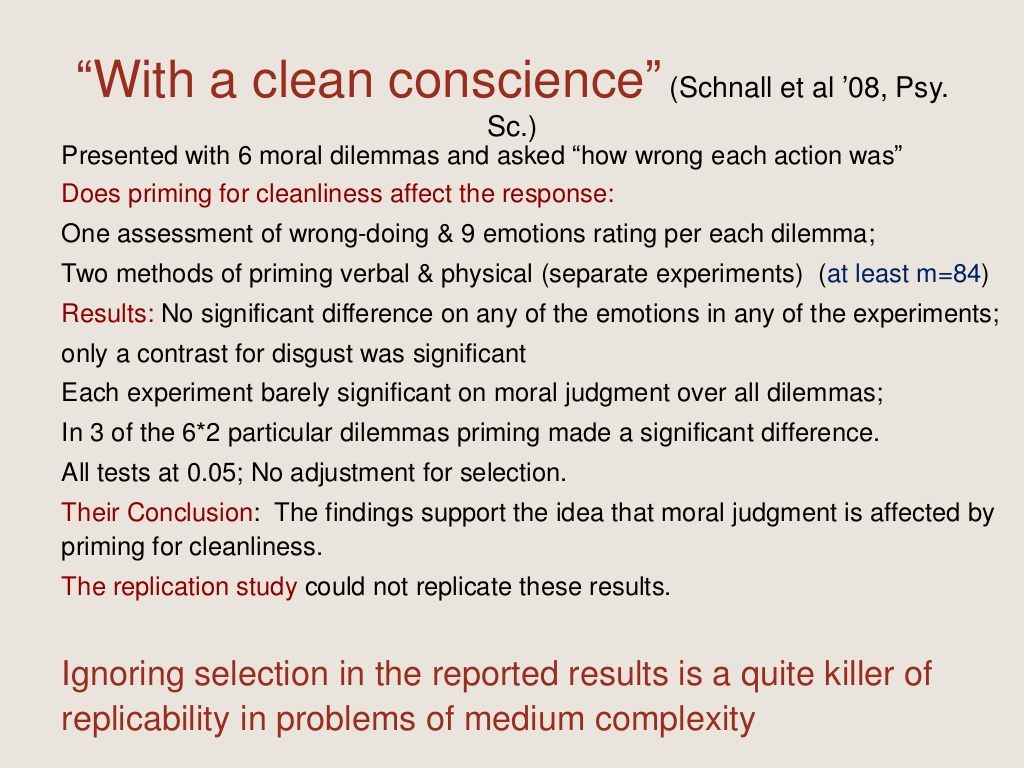 [1] I’ve yet to hear anyone explain why unscrambling soap-related words should be a good proxy for “situated cognition” of cleanliness. But even without answering that thorny issue, identifying the biasing selection effects that were not taken account of vitiates the nominal low p-value. It is easy rather than difficult to find at least one such computed low p-value by selection alone. I advocate going further, where possible, and falsifying the claim that the statistical correlation is a good test of the hypothesis.