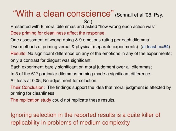 Readers of this blog will recall one of the controversial cases of failed replication in psychology: Simone Schnall’s 2008 paper on cleanliness and morality. In an earlier post, I quote from the Chronicle of Higher Education:
