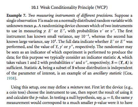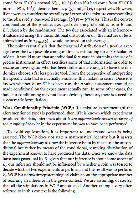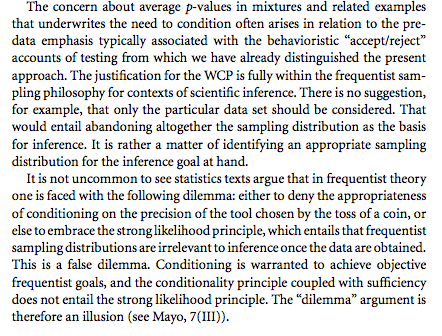 Yes, there are different ways to proceed, and as Lehmann says, there are circumstances where it makes sense to retain the unconditional formulation. If you take Birnbaum’s set-up, as Cox pointed out long ago, it appears you’d have to average over all possible likelihood principle pairs for any outcome. What mainly interests me is that point, and the slippery logical trickery in Birnbaum’s argument that has made it appear that he’s talking about a mixture of 2 weighing machines. It doesn’t go through.