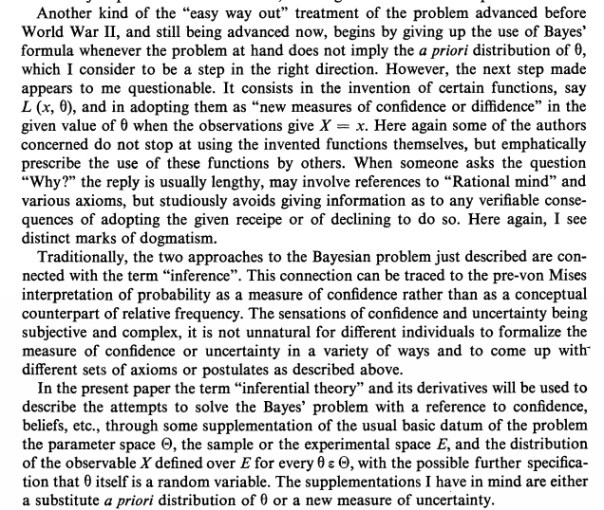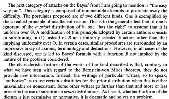 “The principles of Birnbaum appear as a kind of substitutes for known theorems” Neyman says. For example, various authors proved theorems to the general effect that the use of sufficient statistics will minimize the frequency of errors. But if you just start with the rationale (minimizing the frequency of errors, say) you wouldn’t need these”principles” from on high as it were. That’s what Neyman seems to be saying in his criticism of them in this paper. Do you agree? He has the same gripe concerning Cornfield’s conception of a default-type Bayesian account akin to Jeffreys. Why?