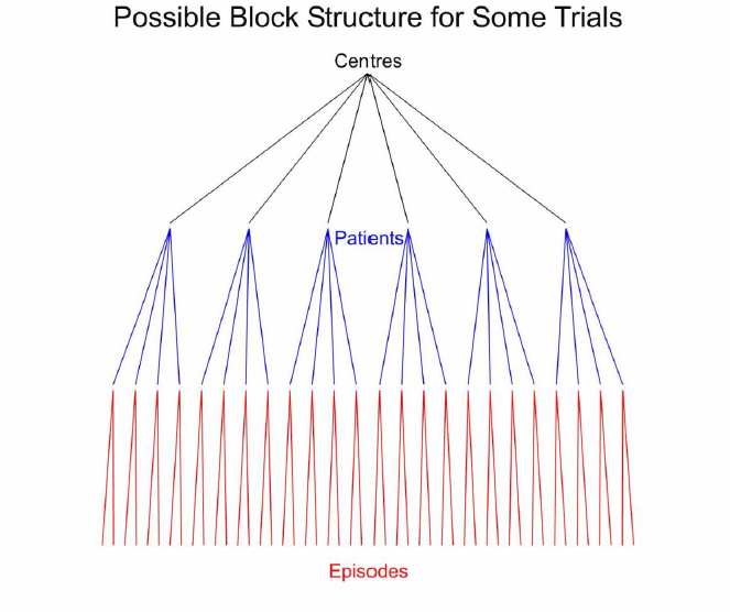 Having some actual data would put flesh on the bones of this skeleton by giving me some mean square errors, but to understand the general structure this is not necessary. It tells me that at the highest level I will have variation between centres, next patients within centres, after that episodes within patients and finally measurements within episodes. Which of these are relevant to judging the effect of any treatments I wish to study depends how I allocate treatments.