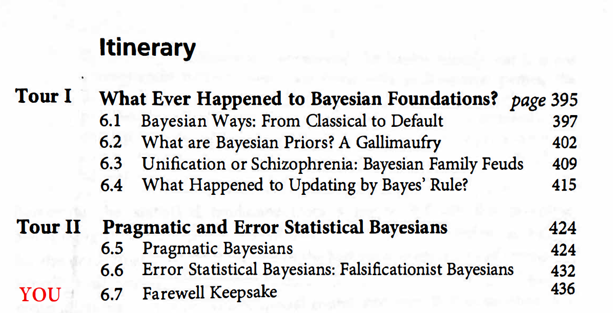 We’ve reached our last Tour (of SIST)*: Pragmatic and Error Statistical Bayesians (Excursion 6), marking the end of our reading with Souvenir Z, the final Souvenir, as well as the Farewell Keepsake in 6.7. Our cruise ship Statinfasst, currently here at Thebes, will be back at dock for maintenance for our next launch at the Summer Seminar in Phil Stat (July 28-Aug 11). Although it’s not my preference that new readers begin with the Farewell Keepsake (it contains a few spoilers), I’m excerpting it together with Souvenir Z (and a list of all souvenirs A – Z) here, and invite all interested readers to peer in. There’s a check list on p. 437: If you’re in the market for a new statistical account, you’ll want to test if it satisfies the items on the list. Have fun!