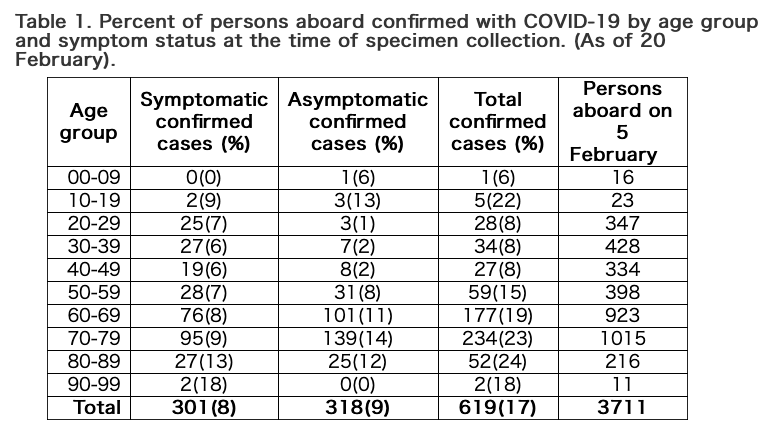 The upshot: As of 19 March 2020, at least 712 out of the 3,711 passengers and crew had tested positive for covid-19; 9 of those who were on board have died from the disease (all over the age of 70). As I was writing this, I noted a new CDC report on the Diamond Princess as well as other cruise ships; they state 9 deaths.[3] A table on the distribution of ages of passengers on the Diamond Princess is in Note [4].