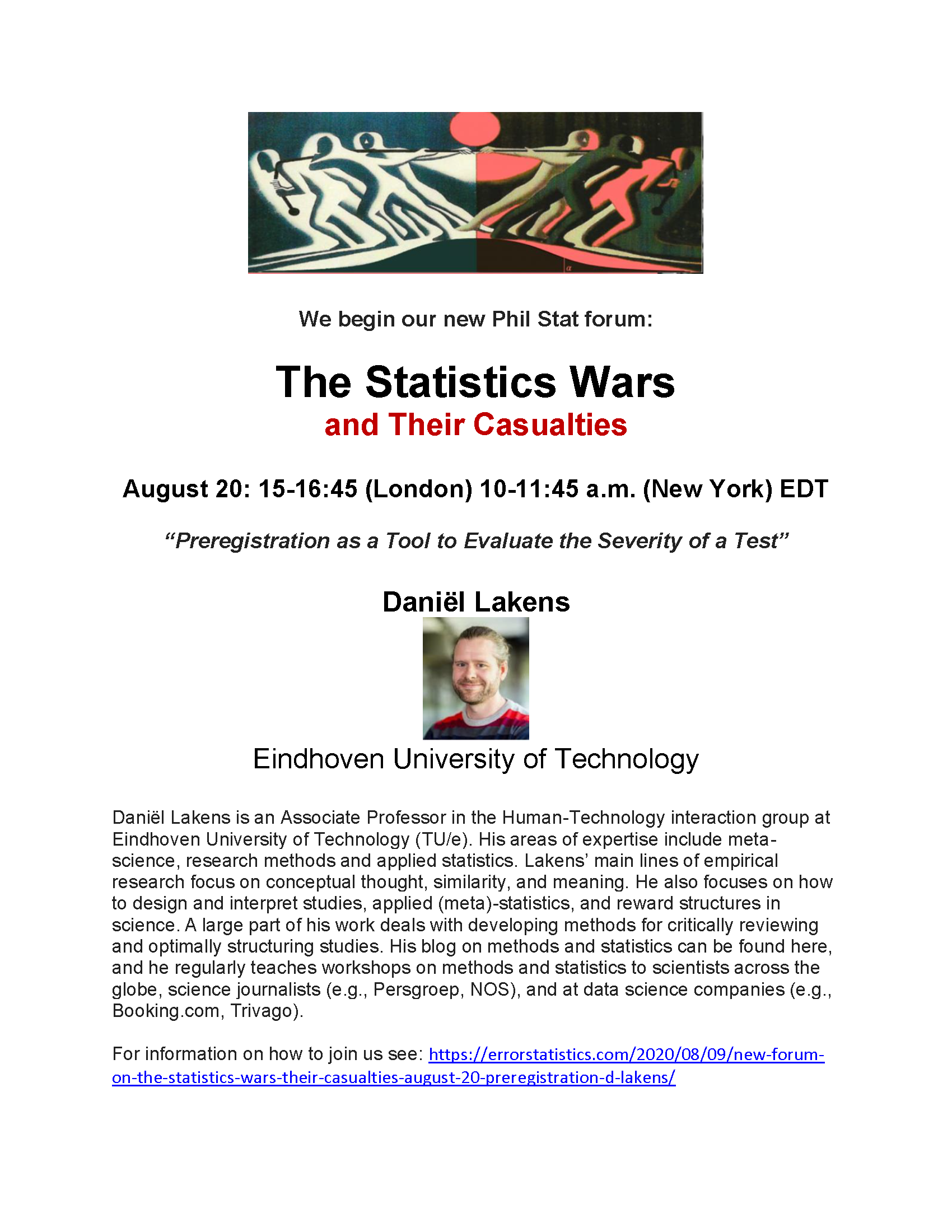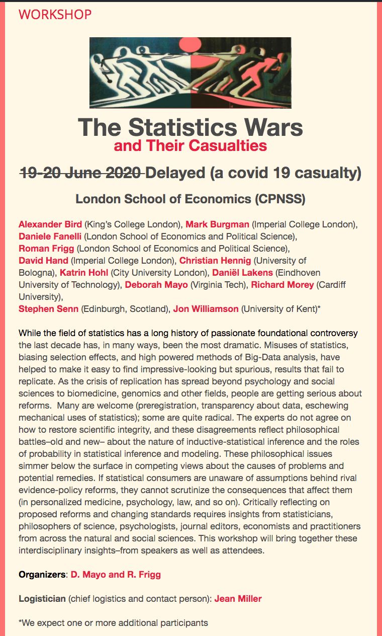 I will now hold a monthly remote forum on Phil Stat: The Statistics Wars and Their Casualties–the title of the workshop I had scheduled to hold at the London School of Economics (Centre for Philosophy of Natural and Social Science: CPNSS) on 19-20 June 2020. (See the announcement at the bottom of this blog). I held the graduate seminar in Philosophy (PH500) that was to precede the workshop remotely (from May 21-June 25), and this new forum will be both an extension of that and a linkage to the planned workshop. The issues are too pressing to put off for a future in-person workshop, which I still hope to hold. It will begin with presentations by workshop participants, with lots of discussion. If you want to be part of this monthly forum and engage with us, please go to the information and directions page. The links are now fixed, sorry. (It also includes readings for Aug 20.) If you are already on our list, you’ll automatically be notified of new meetings. (If you have questions, email me.)
