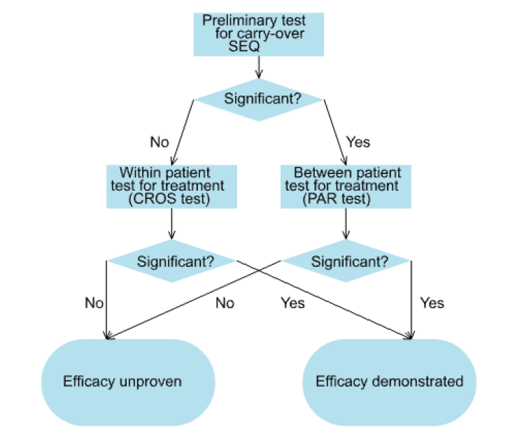 These three tests were then formally incorporated in a testing strategy known as the two-stage procedure[6]as follows. First a test for carry-over was performed using SEQt. Since the test was a between-patient test and therefore of low power, a nominal type I error rate of 10% was generally used. If SEQt was not significant, the statistician proceeded to use CROSt to test the principle hypothesis of interest, namely that of the equality of the two treatments. If however, SEQt was significant, which might be taken as an indication of carry-over, the fallback test PARt was used instead to test equality of the treatments.
