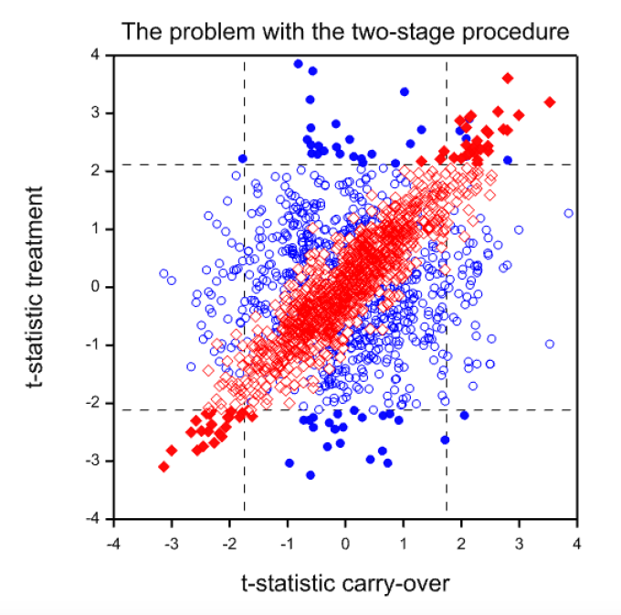 The second point is the one that Andy refers to. If one wishes to cure this by employing a Bayesian approach, then in addition to the correlation between the statistics PAR and SEQ to which my blog refers, there is the issue of correlation of parameters. Over all classes of treatments and diseases it seems much more reasonable to suppose that large carry-over effects are rare if treatment effects are modest. Handling this by finding suitable joint priors is not so easy. A similar situation arises in connection with random effects meta-analysis and an amateurish effect of mine to handle it can be found here: https://www.onlinelibrary.wiley.com/doi/abs/10.1002/sim.2639