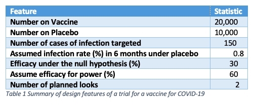 Well actually, not from A to Z but from AZ. That is to say, the trial I shall consider is the placebo- controlled trial of the Oxford University vaccine for COVID-19 currently being run by AstraZeneca (AZ) under protocol AZD1222 – D8110C00001 and which I considered in a previous blog, Heard Immunity. A summary of the design features is given in Table 1. The purpose of this blog is to look a little deeper at features of the trial and the way I am going to do so is with the help of geometric representations of the sample space, that is to say the possible results the trial could produce. However, the reader is warned that I am only an amateur in all this. The true professionals are the statisticians at AZ who, together with their life science colleagues in AZ and Oxford, designed the trial.