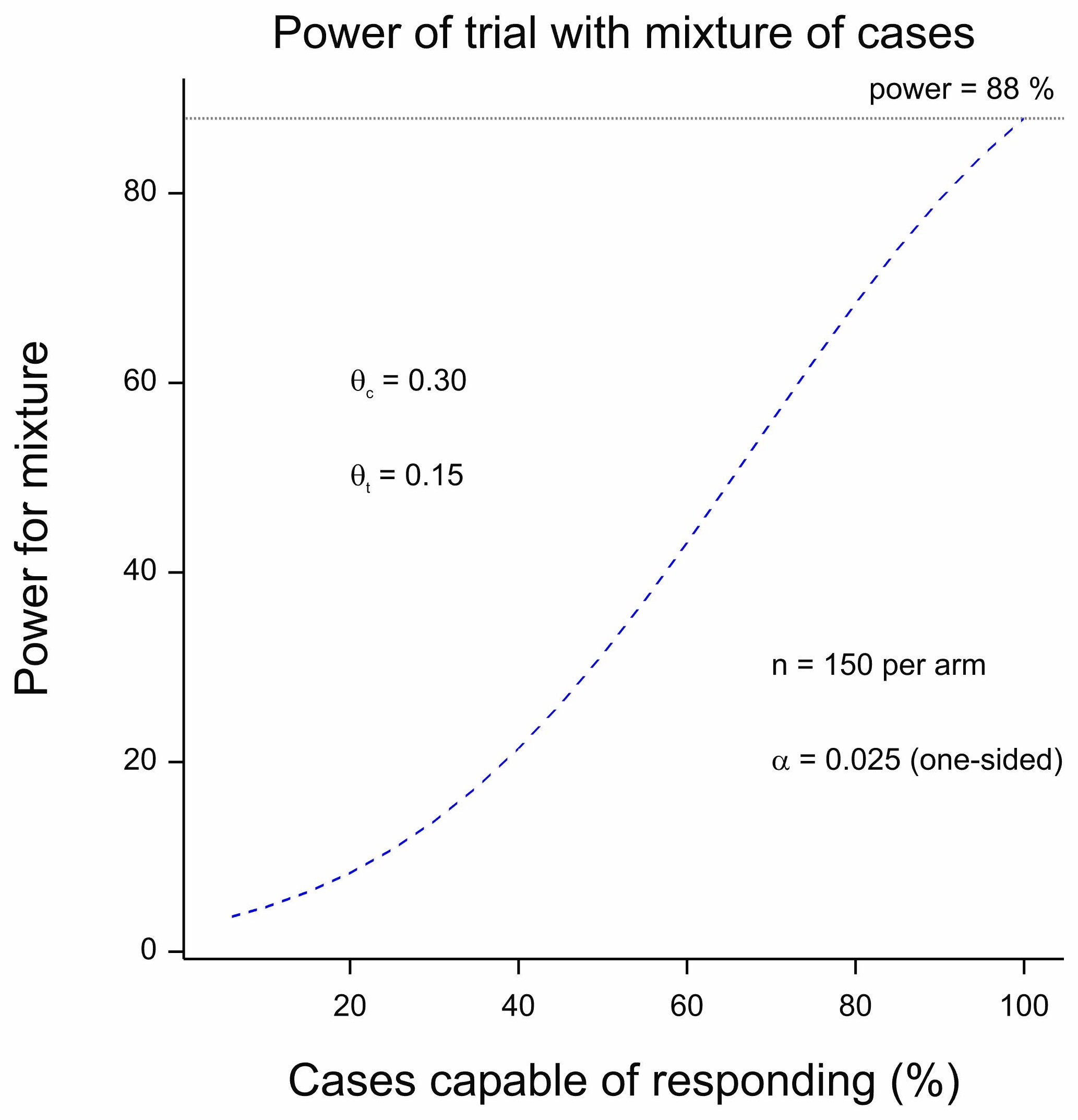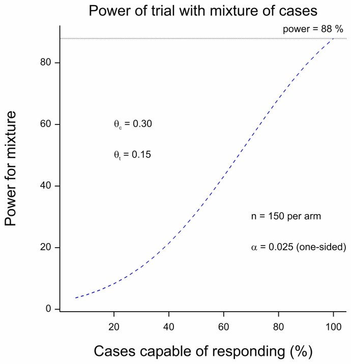 Figure 2 Power for a trial as a function of the proportion of cases capable of responding.