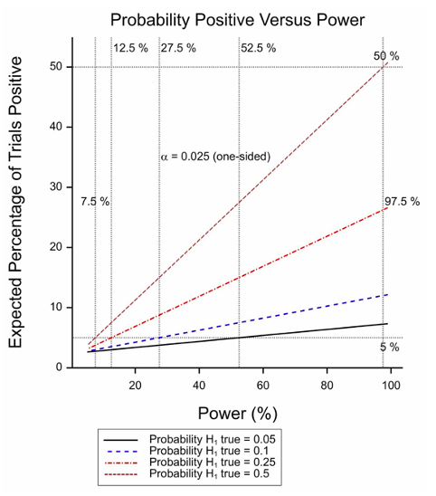 Figure 1 Expected percentage of positive trials as a function of power for various probabilities of the treatment being effective.