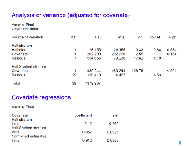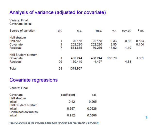 the instructions are complete. The output is given in Figure 2. The following points are important. First, the significance of the effect of treatment is judged by using the variation between halls. The output distinguishes two strata: the Hall stratum and the Hall.Student stratum. Only the former is used in judging the effect of treatment because the treatment has been varied between halls. It would be a mistake, analogous to analysing a cluster randomised trial[7] as if it were a parallel group trial, to use the Hall.Student stratum to judge the effect of diet. The second point is that there are different regression coefficients between and within halls. The former is estimated to be 0.42 ( I had set it to 0.5 for the simulation) and the latter to 0.957 (I had set it to 0.8 for the simulation). Given the level at which treatment is varied, the first of these and not the second is relevant for adjusting final weights. See Yoon and Welsh for a general investigation of correlations for multilevel data[8] and Kenward and Roger for the issue as it occurs in cross-over trials[9]. For earlier discussions of technical matters to do with more complex multi-level experiments see Zelen [10], Ratcliff et al [11] and Payne and Tobias[12].