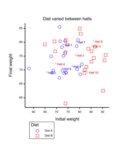 Figure 1 Scatter plot of final against initial weights for 40 students. Five halls have used diet A (blue circle) and five have used diet B (red square). Hall means are indicated by asterisks.