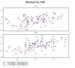 It is now decided to assign students independently to a diet. There is no attempt to block this by hall. (This would be a reasonable strategy if one believed the effect of  Hall was negligible.) To what degree numbers are balanced by diet within halls is a matter of chance. As it turns out, the disposition of students is like this.