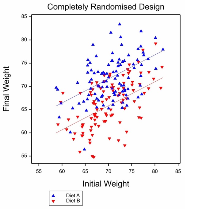 Another thing I learned in those early years was the importance of clearly identifying the “experimental material” and “experimental unit” in any design. Cox (planning of Experiments, 1958) defines an experimental unit as “corresponding to the smallest division of the experimental material such that any two units may receive different treatments in an experiment”. According to this definition it seems to me that in both Variant 1a and 1b the experimental unit is the hall. So, in both cases we have two halls (units), each receiving a different treatment (diet), and so no scope for carrying out a meaningful analysis. The variation between students is a sub-unit concept of no use in comparing the two diets. In my opinion, the random allocation of students to the two halls in Variant 1b does not change the structure of the experiment when compared with 1a – the treatment (diet) is still applied to the hall (unit), not the student. Now it all depends on how the diets were administered, a detail that we are not given. If 100 students living in 100 houses were allocated at random to one of two diets and had to self-administer the diet, then the experimental unit would be the student – a fully randomised design with no block structure, 100 units and two treatments. But in a hall the students are most likely all eating in a dining room with the diet prepared by catering staff; any misunderstanding or mistake made by the catering staff will then apply to all 50 students on that diet, who are therefore not independent units.