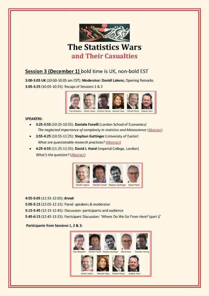 - “What Happened So Far”: A medley (20 min) of recaps from Sessions 1 & 2: Deborah Mayo (Virginia Tech), Richard Morey (Cardiff), Stephen Senn (Edinburgh), Daniël Lakens (Eindhoven), Christian Hennig (Bologna) & Yoav Benjamini (Tel Aviv).