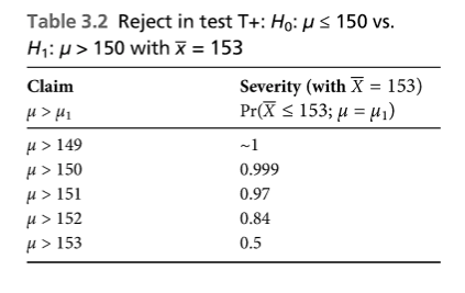 In each case, we are making inferences of form: μ > μ1 = 150 + γ, for different values of γ. To merely infer μ > 150 , the severity is 0.97 since Pr(X ≤ 152; μ = 150) = Pr(Z ≤ 2) = 0.97. While the data give an indication of non-compliance, μ > 150, to infer C: μ > 153 would be making mountains out of molehills. In this case, the observed difference just hit the cut-off for rejection. N-P tests leave things at that coarse level in computing power and the probability of a Type II error, but severity will take into account the actual outcome. Table 3.2 gives the severity values associated with different claims, given x = 153.