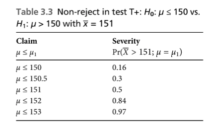 Can they at least say that x = 151 is a good indication that μ ≤ 150.5? No, SEV(T+, x = 151, C: μ ≤ 150.5) ≅ 0.3, [Z = 151 – 150.5 = 0.5]. But x = 151 is a good indication that μ ≤ 152 and μ ≤ 153 (with severity indications of 0.84 and 0.97, respectively).
