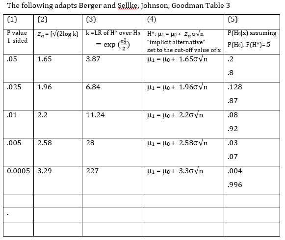 adapts Berger and Sellke, Johnson, Goodman Table 3 this has the empty 3 rows underneath.